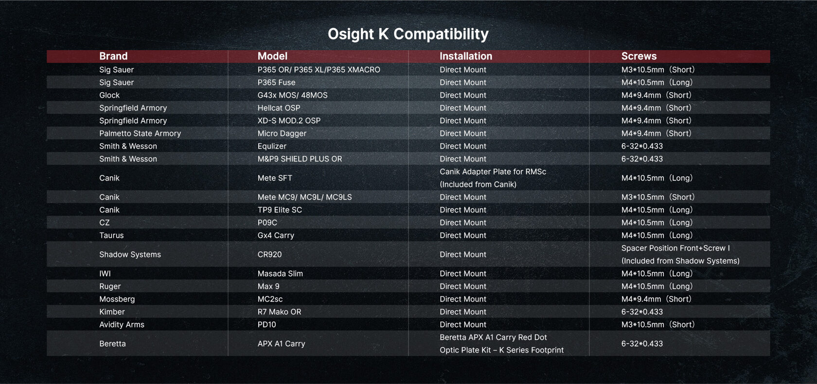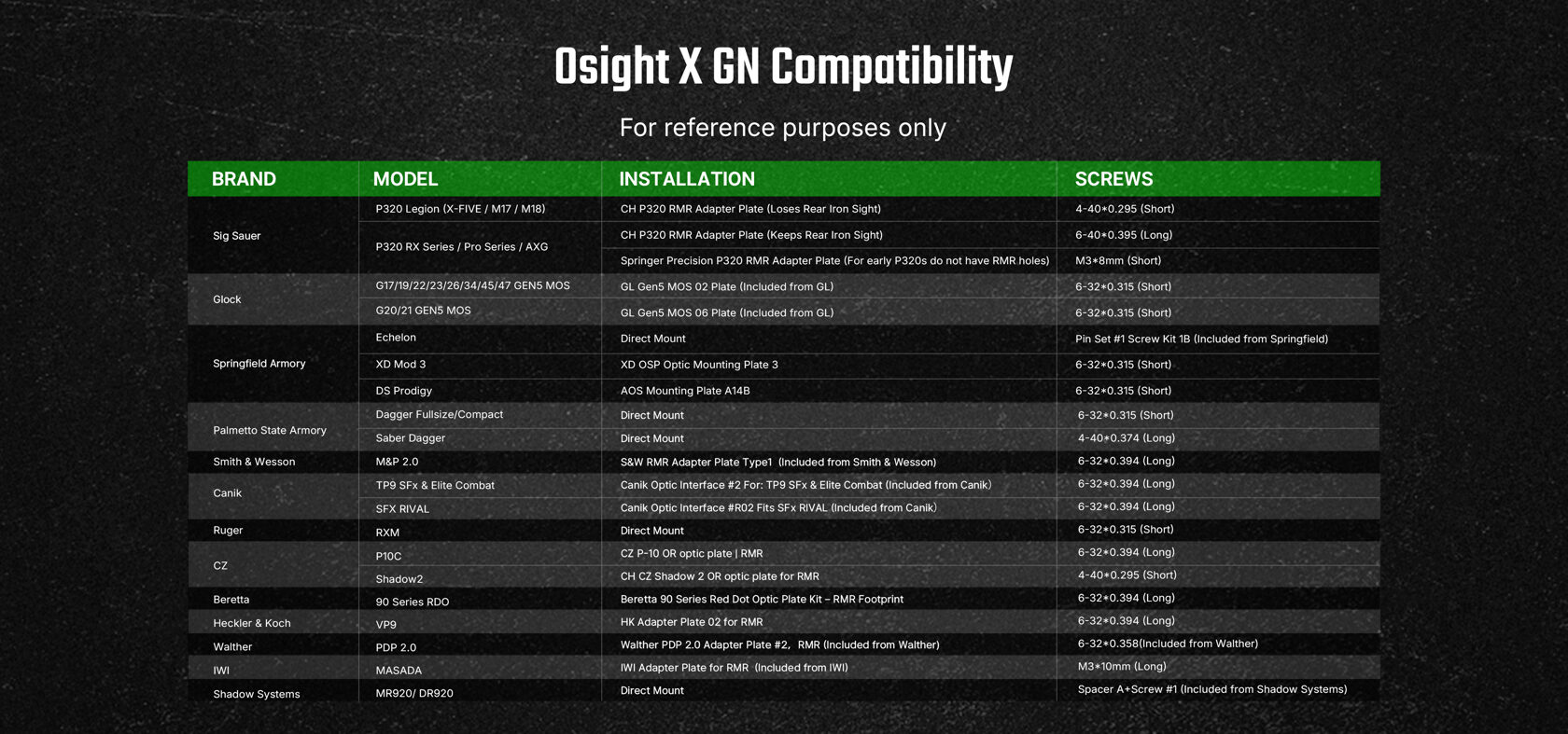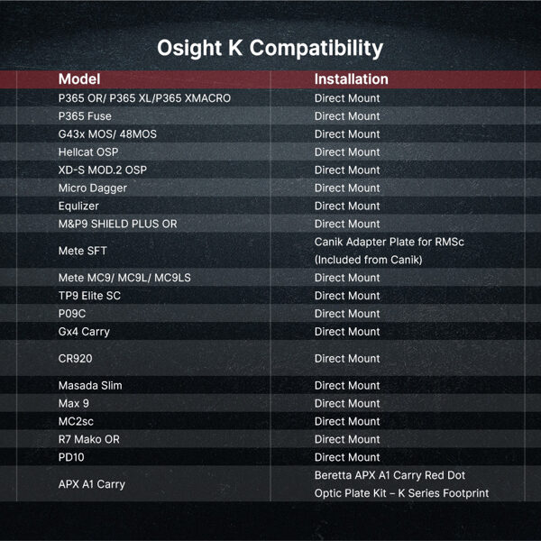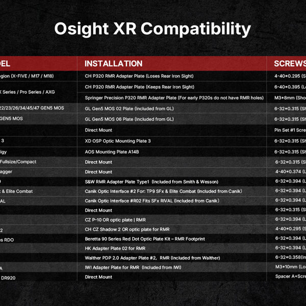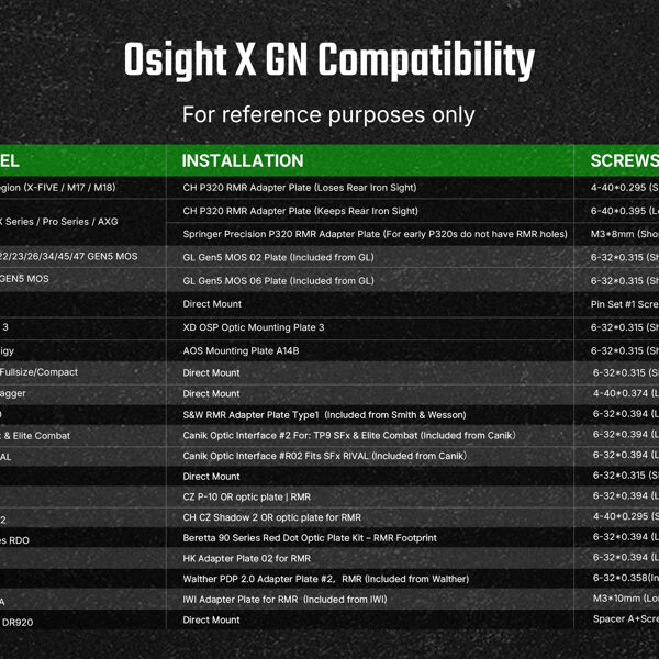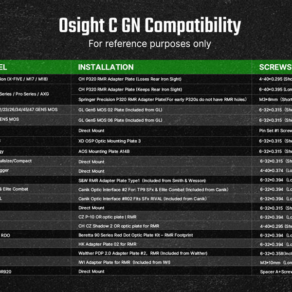Ja nav pārliecības par saderību ar konkrētu pistoles modeli, lūdzam kontaktēties ar mums vai apskatīt šo saderības lapu ASV Osight veikalā. Diemžēl mums pašiem vēl nav izdevies uzprogrammēt līdzvērtīgu saderības pārbaudes rīku.